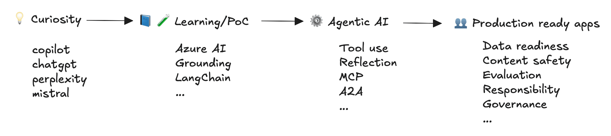 This led me from experimenting with surface‑level capabilities to pursuing a structured learning path—starting with Azure AI services, preparing for the AI Fundamentals certification, exploring Agentic AI and testing orchestration frameworks. The goal was simple: to move from curiosity to confidence and to learn how to craft solutions that effectively integrate rapidly evolving AI capabilities without losing sight of reliability or purpose.